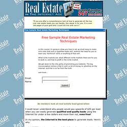 This video tells you how you can get 2 more free videos that show you how to easily get free real estate leads from the Internet. These techniques are used by many top producing real estate agents with amazing results. Category Howto & Style; ... View Video